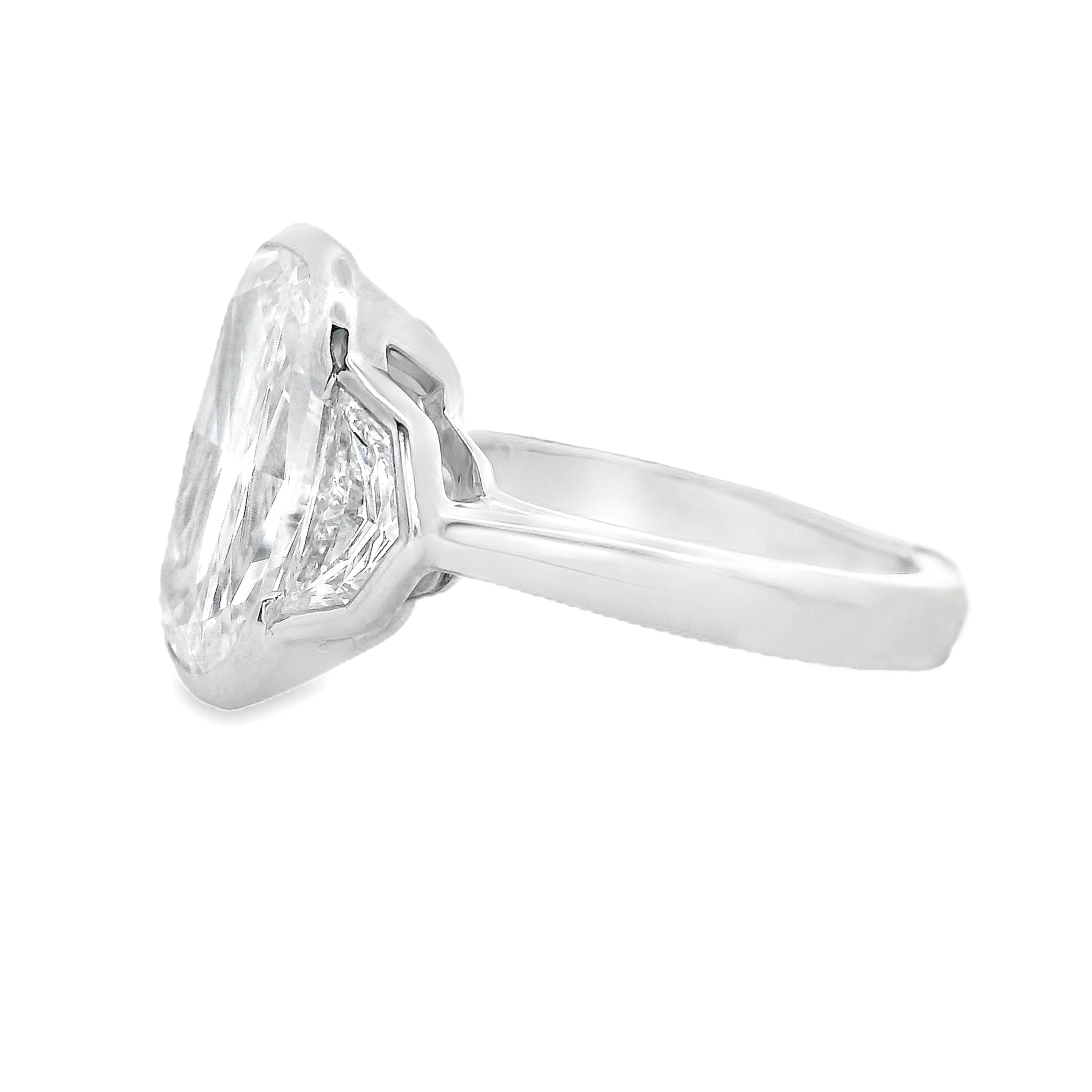 This stunning platinum ring features a center diamond and 2 side diamonds. The center elongated cushion diamond weighs approximately 5.01ct and is certified by the GIA to be H in color and SI1 in clarity. The 2 side stones total approximately 1.00ct.