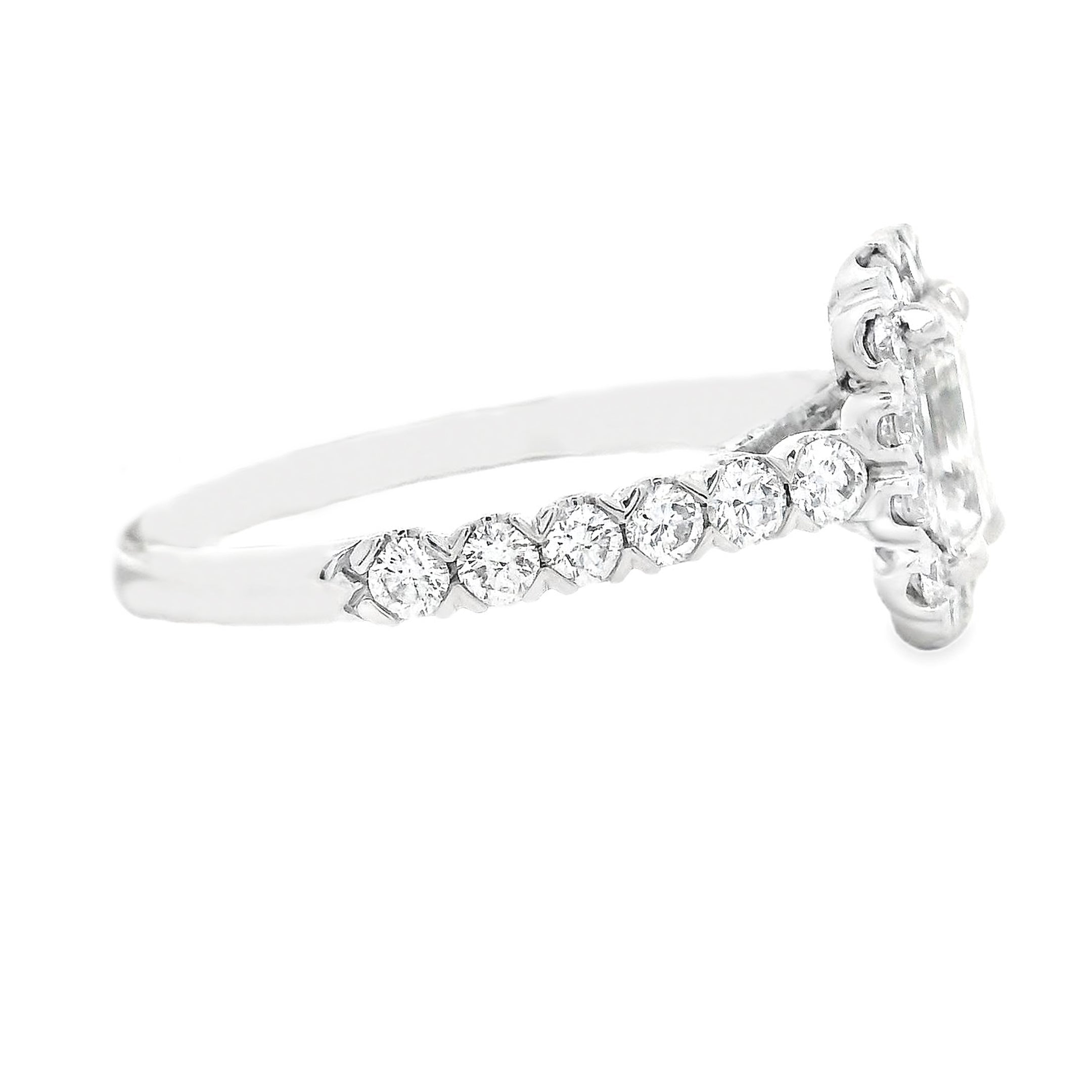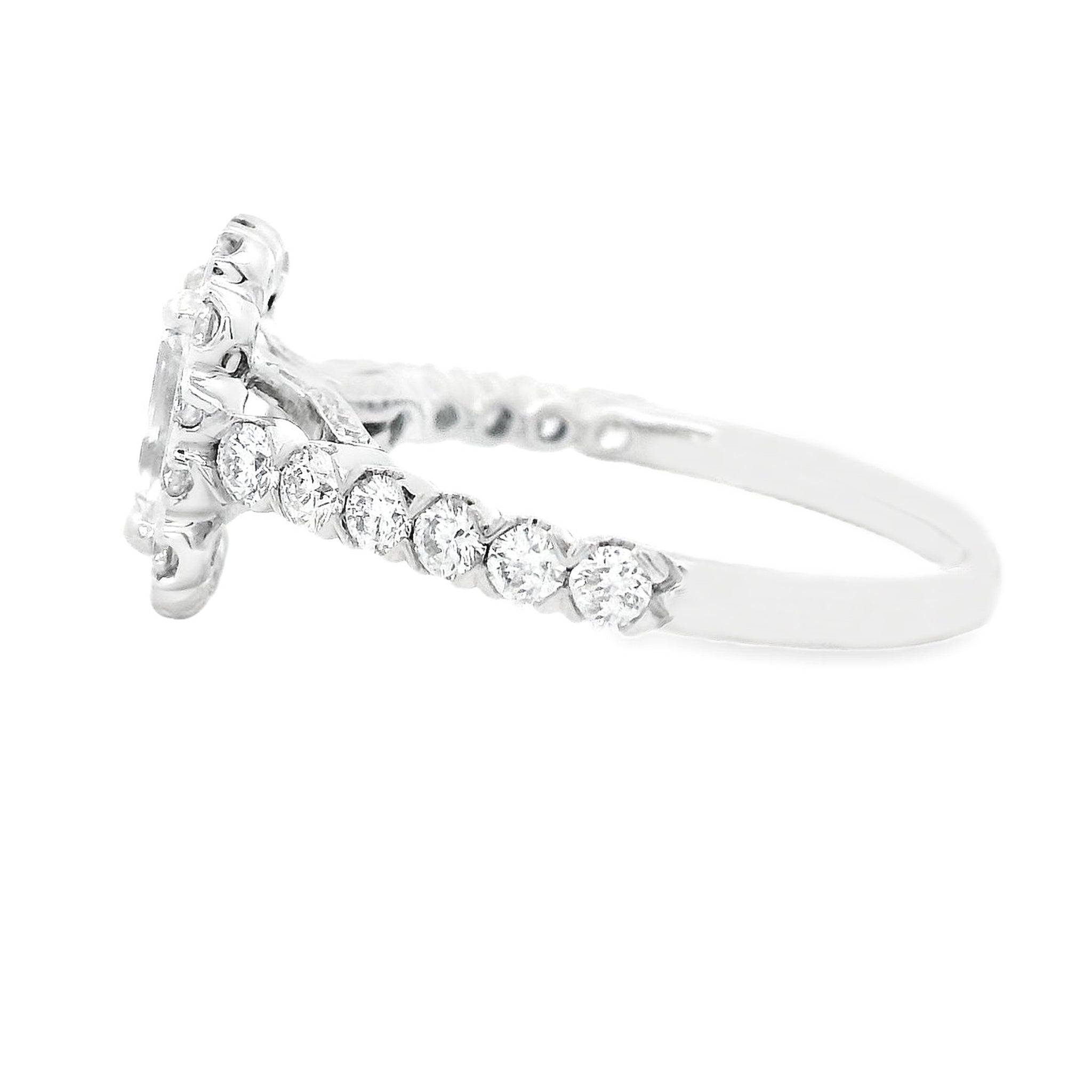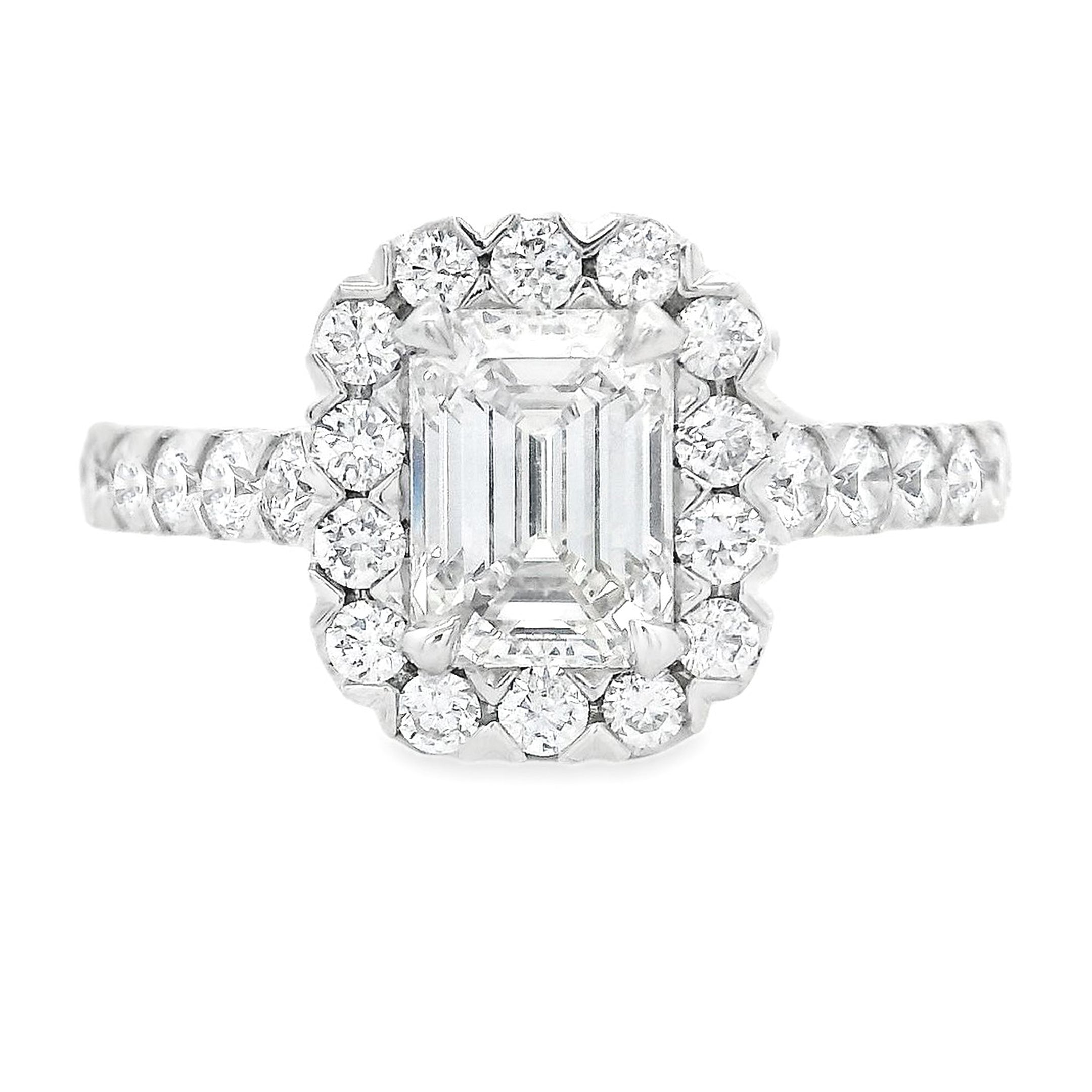 This stunning halo engagement ring features an emerald cut diamond that weighs 1.10ct; H/I in color and VS in clarity. In addition to the halo, pave-set diamonds run halfway down the 14k white gold band totaling approximately .72ct.